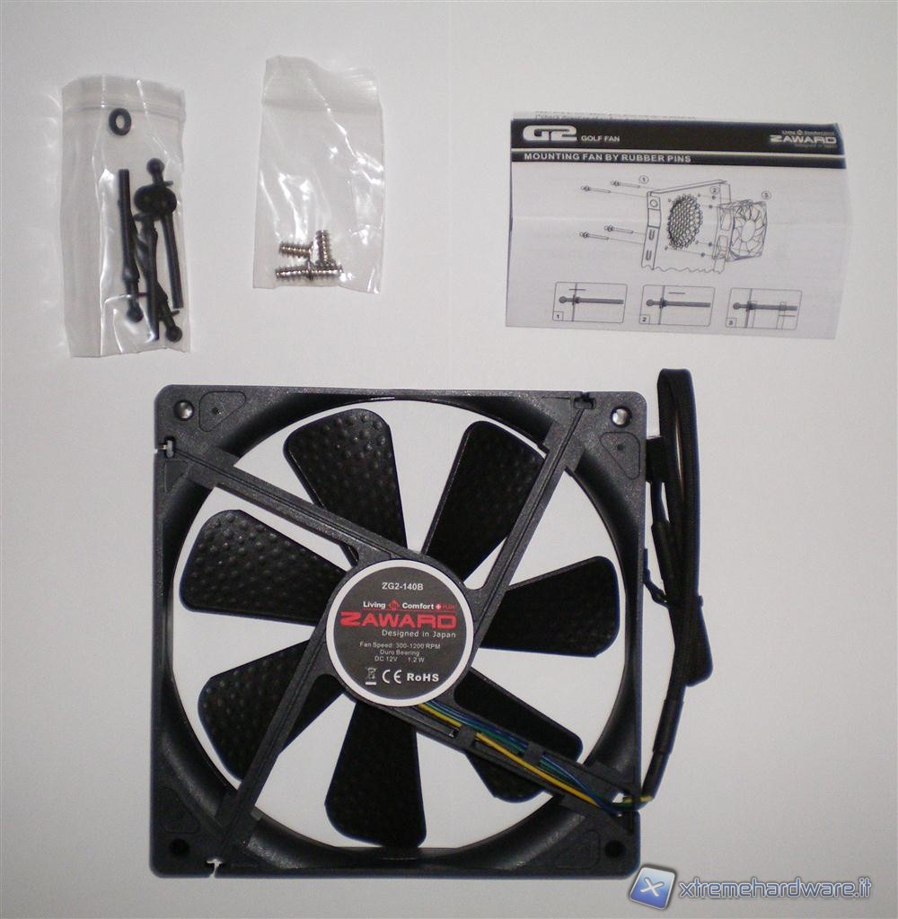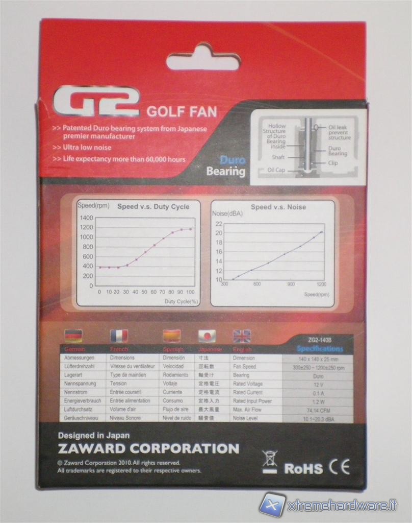 La confezione si presenta con una scatola con sfondo rosso e nero. Nel frontale è possibile osservare una parte della ventola grazie alla presenza della plastica trasparente che ci permette di osservare la ventola in maniera reale. Sono presenti descrizione di tutte le caratteristiche tecniche, Duro Bearing, Golf Dimple, che garantisce un livello di rumore molto basso. Vi è inoltre indicato il modello ed altre informazioni attinenti al prodotto. In rilievo possiamo osservare la dicitura Golf Fan G2 che ci fa capire la serie del prodotto e la dimensione della ventola che nel nostro caso è 140mm.